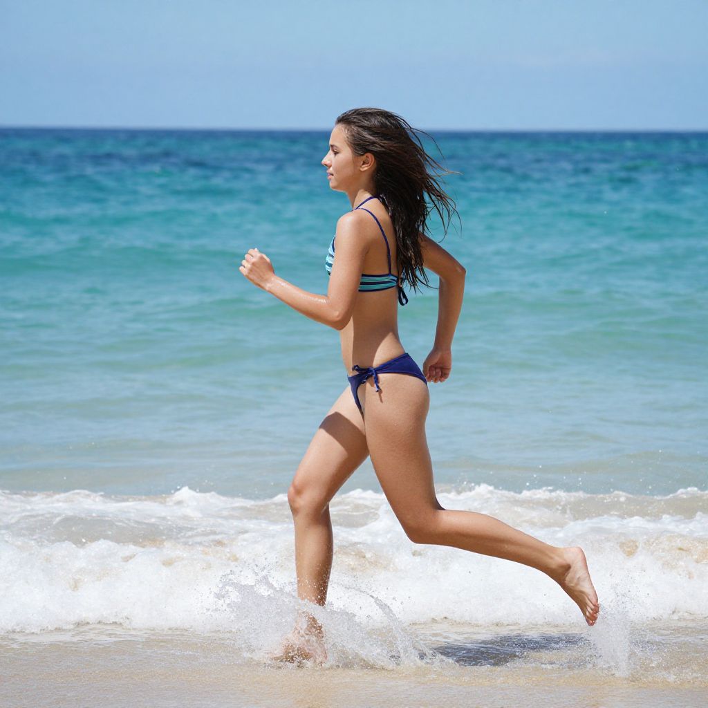 Photograph of a young woman with long dark hair, wearing a blue and white striped bikini, running in the shallow ocean waves on a sunny beach.