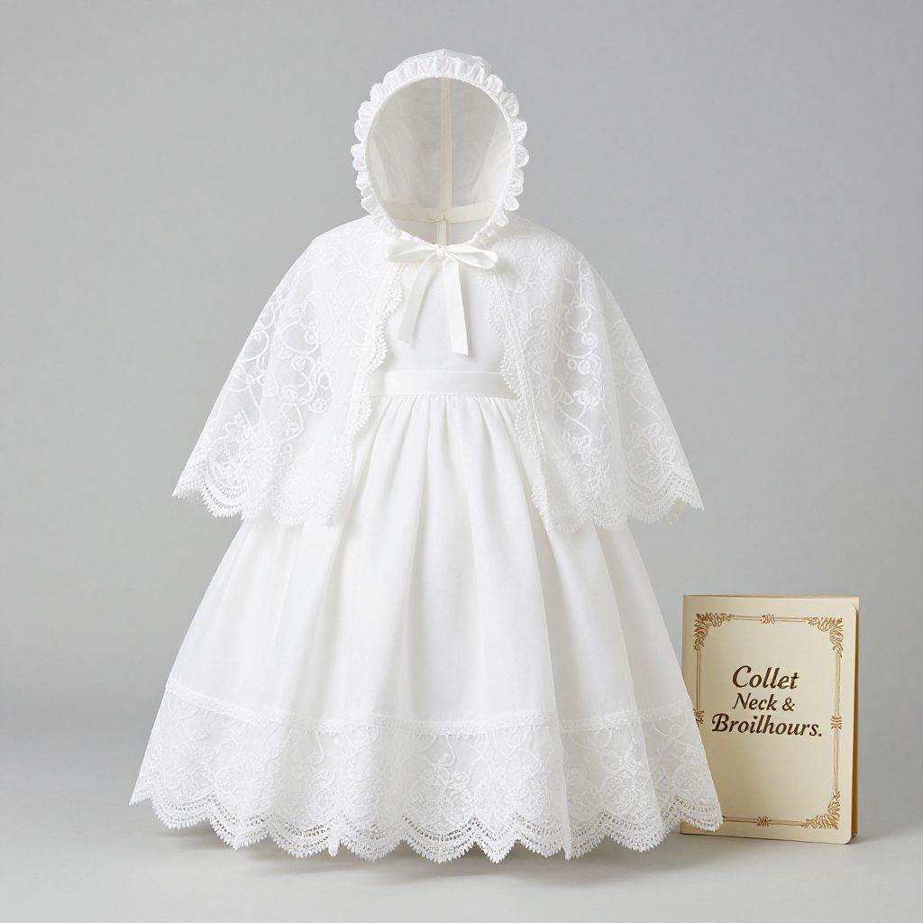 Elegant white baptism dress set for a one-year-old girl, featuring a lace-trimmed gown with a matching bonnet and cape, displayed alongside a decorative notebook titled \"Collet Neck & Broilhours.\
