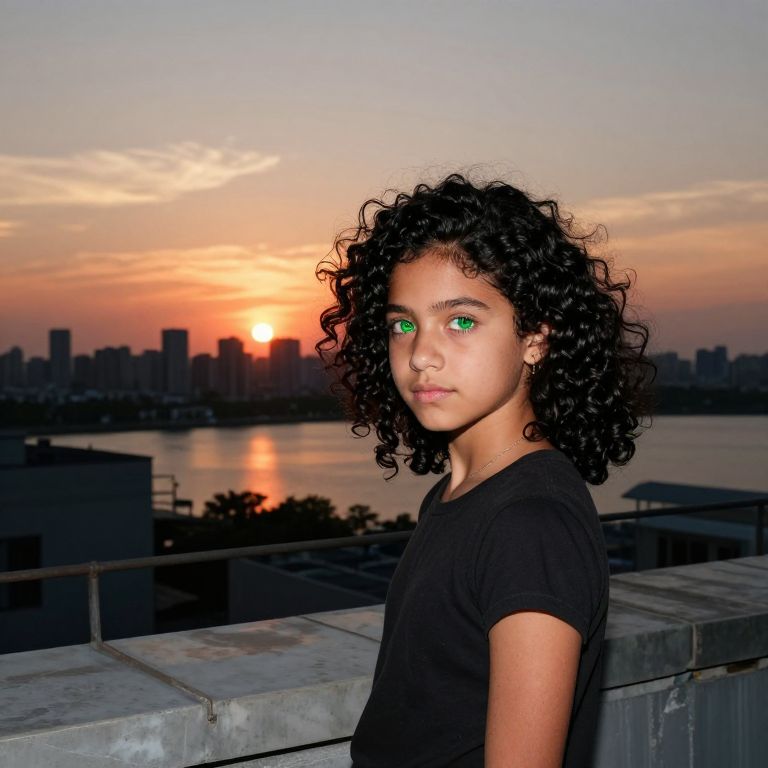 Photograph of a young girl with curly black hair, green eyes, and olive skin, wearing a black t-shirt, standing on a rooftop at sunset