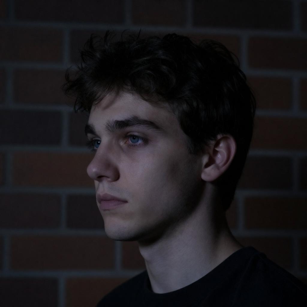 Photograph of a Caucasian man with short, curly brown hair, wearing a black shirt. He has a bruise on his right cheek and a neutral expression. He is standing against a dark, ured wall, looking slightly to the left. Light from the left casts a shadow on the right side of his face.