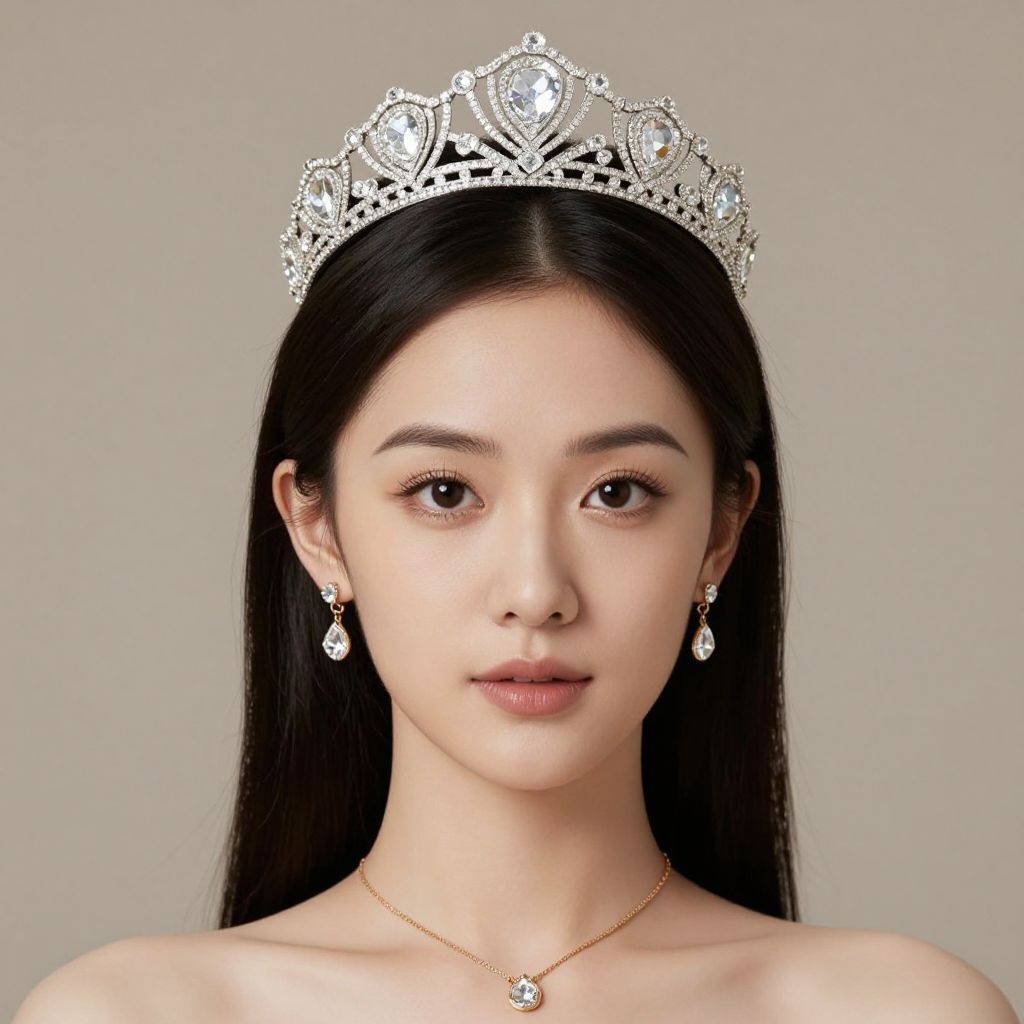 Elegant woman wearing a sparkling Royal Rose Tiara, complemented by a delicate gold necklace and matching earrings, exudes regal charm against a neutral backdrop.