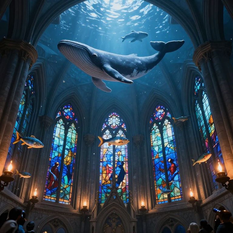 In a surreal realm where gravity bends and boundaries blur, a cathedral emerges from the depths, its stained-glass arches illuminated by the soft glow of oil lamps carried by fish, while whales drift serenely through the air, evoking a profound sense of wonder and the transcendence of earthly constraints.