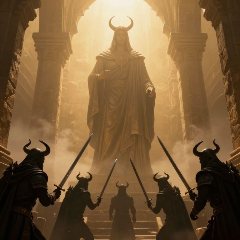 Amidst the hazy embrace of ancient stone and golden light, a towering figure stands as a silent sentinel, while a shadowy host of horned warriors gathers below, their swords clashing in a symphony of unseen conflict, evoking a profound sense of existential tension and the eternal dance between power and subjugation.