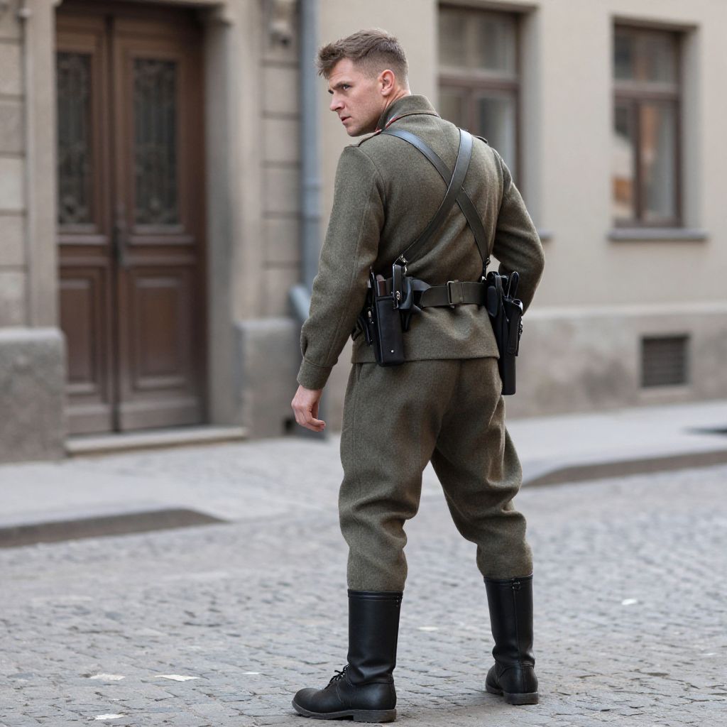 Photograph of a young Caucasian man with short brown hair, standing on a cobblestone street. He wears a brown, WWII-era German military uniform with a leather strap across his chest, black boots, and a belt with a holster and pistol. He faces away, looking over his shoulder. The background features a beige building with tall, double wooden doors and a small window. The image has a realistic, historical style.