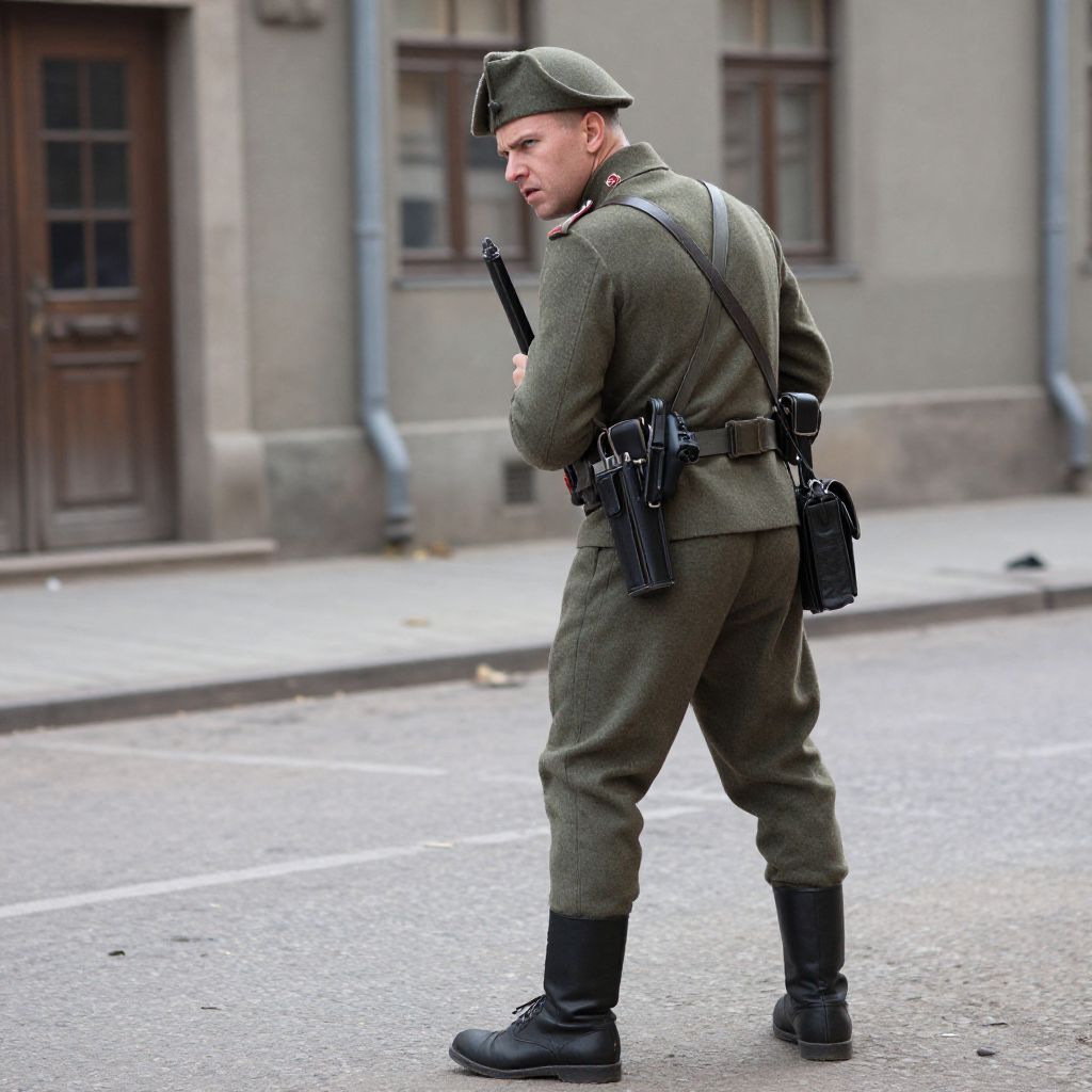 Camel Hair Full body shot of an armed german WW2 officer back turned in the street, lookink suspiciously on his left, realistic, detailed 40s photograph,