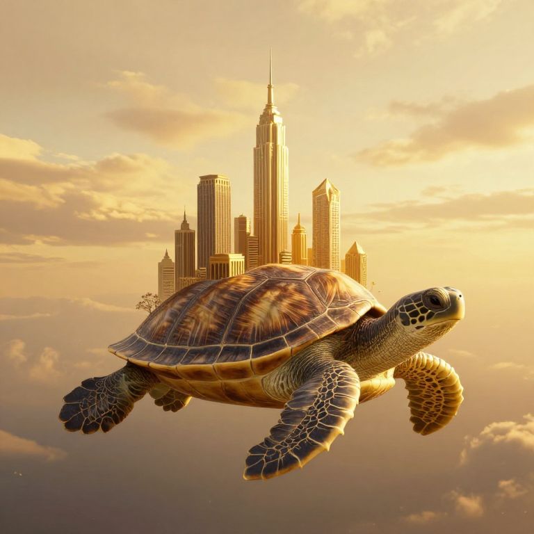 A city shaped like a bird nests on the back of a floating turtle, its spires growing from the shell like feathers, drifting across a sky of molten gold.
