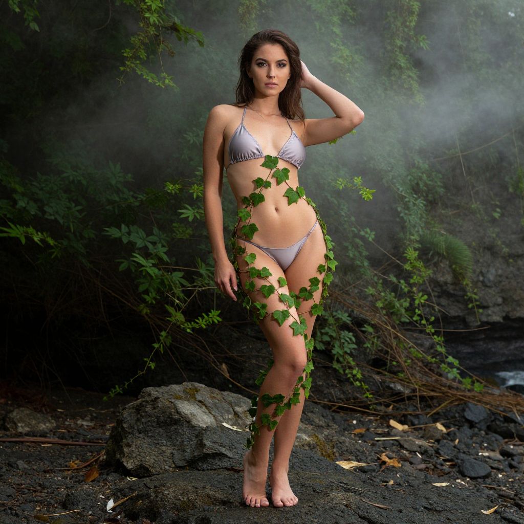 Poison ivy in bikini, elegant woman with ivy tendrils wrapping around her body as a bikini, standing on rocky shore, mystical fog, lush greenery, high contrast lighting, painterly style