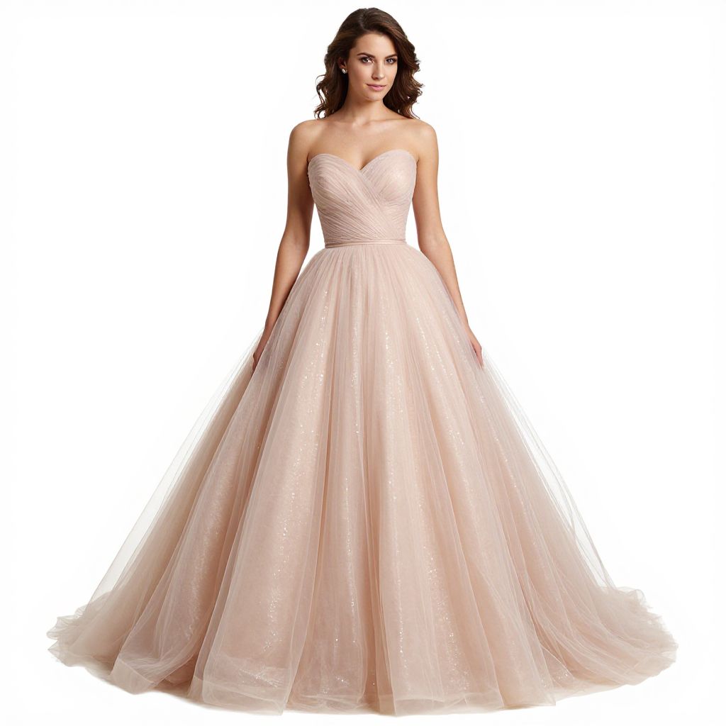 "Woman, romantic glamour, strapless ball gown in blush pink, sweetheart neckline, fitted bodice, sparkling tulle overlay, full voluminous skirt, floor length, subtle glitter throughout the fabric, minimal jewelry with stud earrings, hair styled in loose waves, isolated on a white background.. Sexy. Pretty face and beаutiful eyes. Big breasts."
