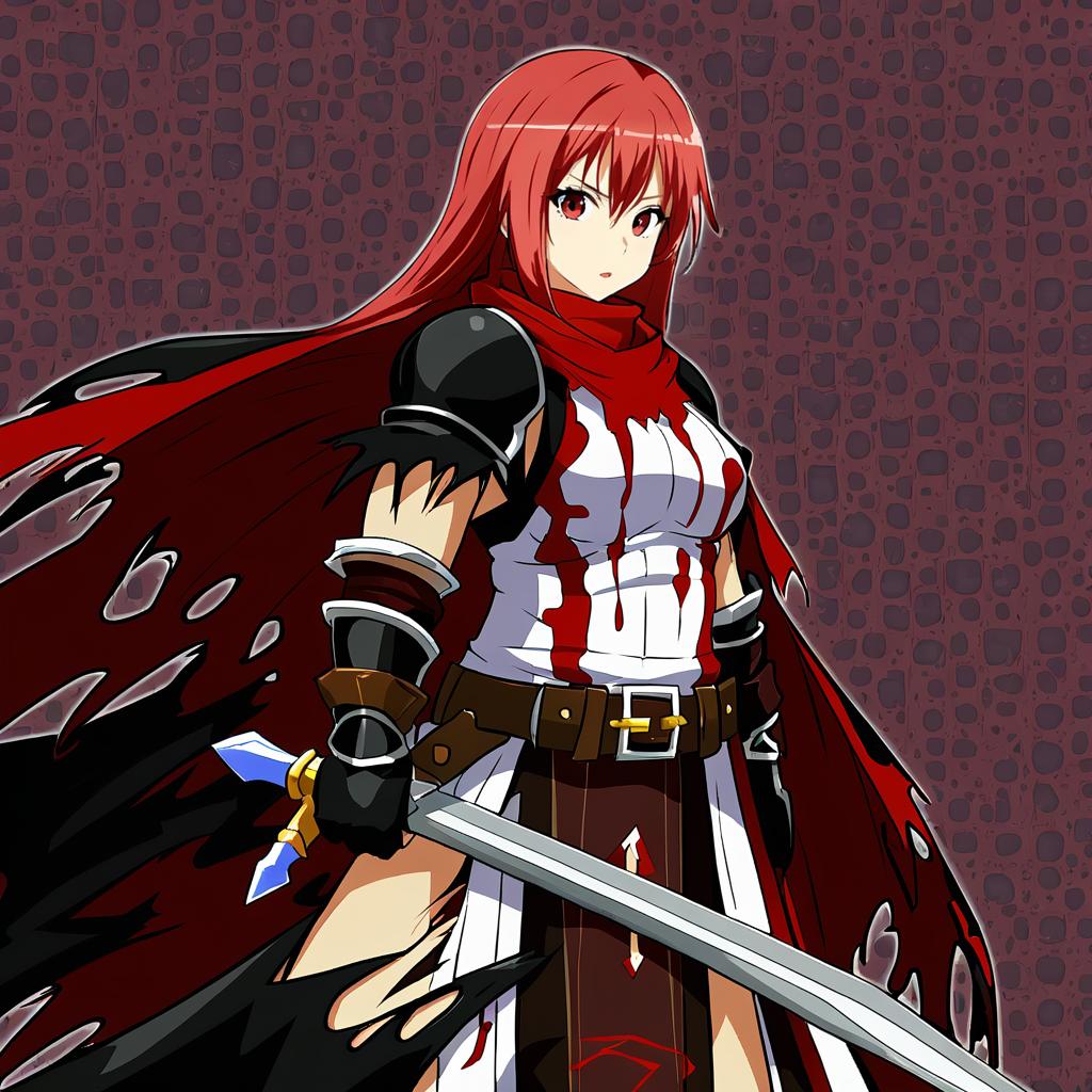 Assassin cross (ragnarok online), ragnarok online, 1girl, hair between eyes, red eyes, long hair, medium breasts, large breasts, red scarf, torn scarf, elbow gloves, waist cape, torn cape, black cape, vambraces, pauldrons, by artist uranaishi (miraura), anime