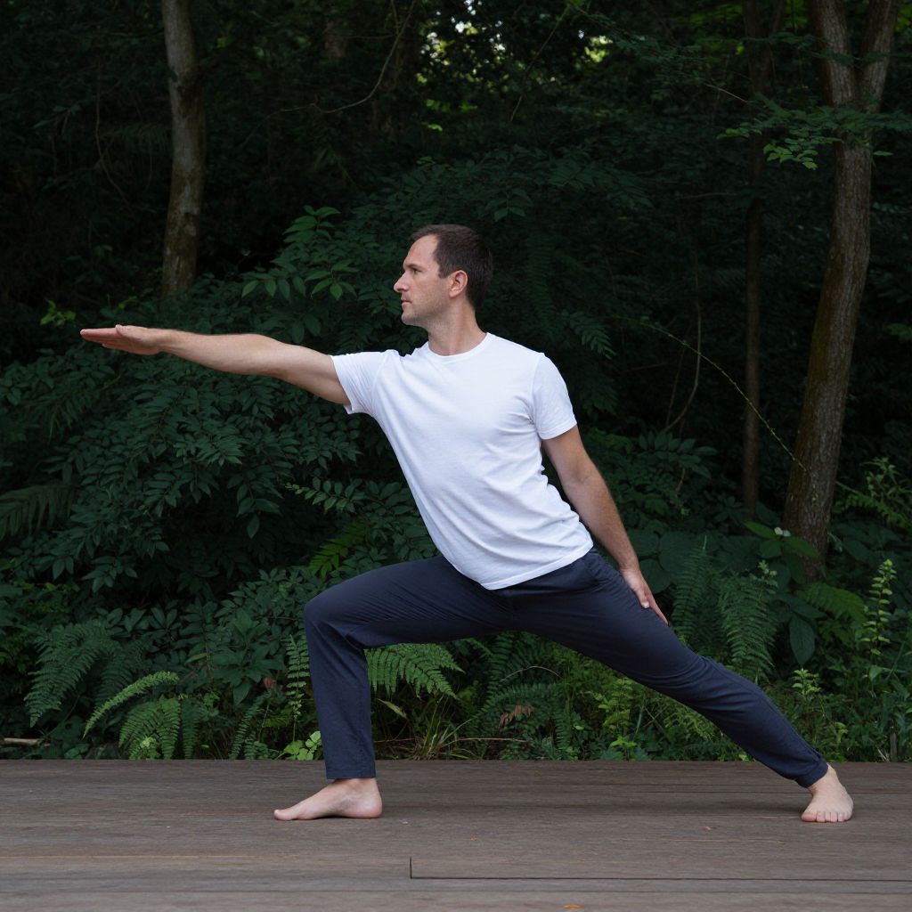 A photograph of a man doing a yoga pose on a wooden platform surrounded by dense, dark green foliage. He's wearing a white t-shirt and dark gray pants, barefoot, with his right arm extended forward and left arm back, right leg bent, and left leg straight. The background is a lush, forested area. The lighting is natural, highlighting the man's focused expression.