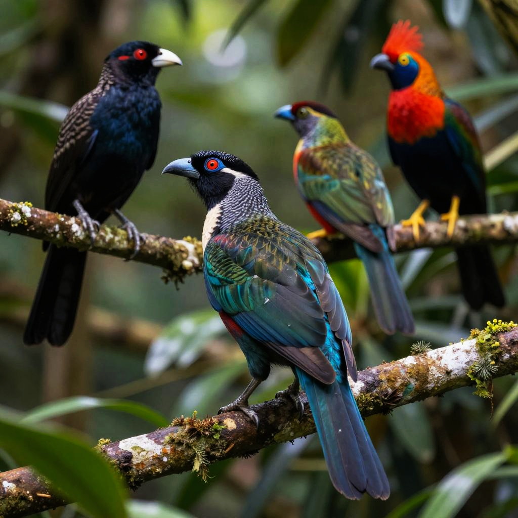Sorten of exotic birds perched on tropical branches in dense jungle, intricate feather details, bright plumage, high contrast lighting, dynamic composition