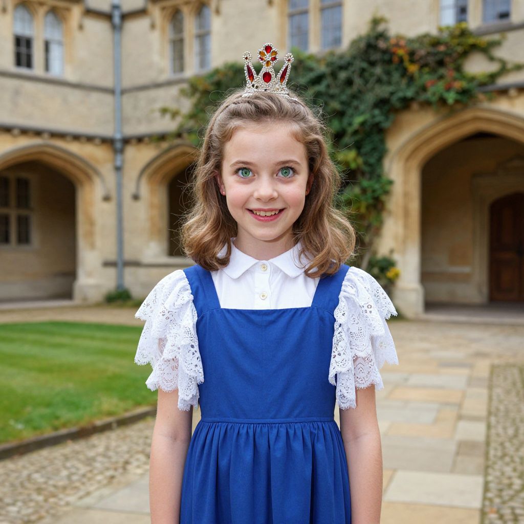 A detailed, natural lighting photograph of a British schoolgirl in a whimsical fancy dress costume, dressed as a 1930s royal maid in a royal blue dress with lace sleeves and a small crown on her head; she has large, expressive green eyes, a bright smile, and a shy look, standing in a historic Oxford courtyard with ancient stone arches and ivy-covered buildings.