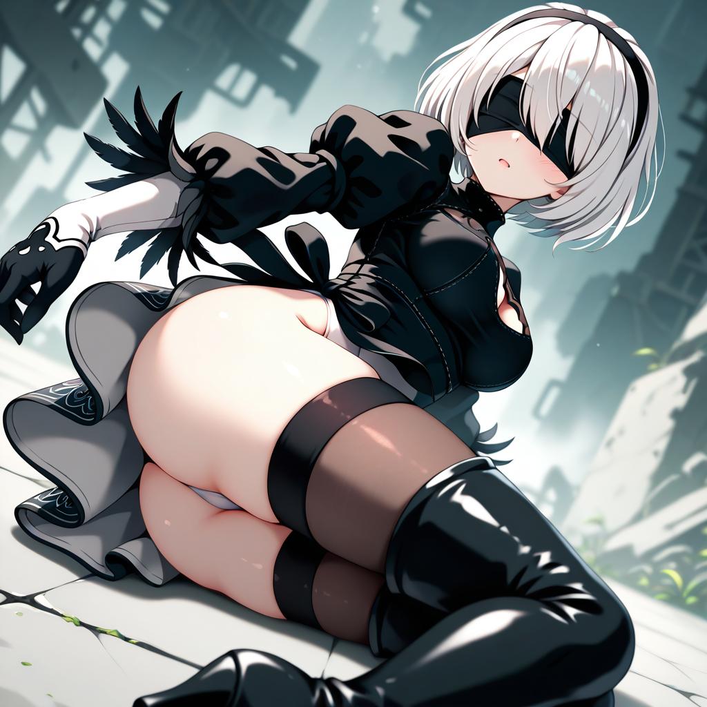 2b (nier:automata), nier (series), 1girl, mole under mouth, short hair, white hair, black hairband, medium breasts, large breasts, cleavage cutout, cleavage, ass, thighs, thigh boots, highleg leotard, black thighhighs, black dress, black gloves, juliet sleeves, black blindfold, by artist c (theta), illustrious