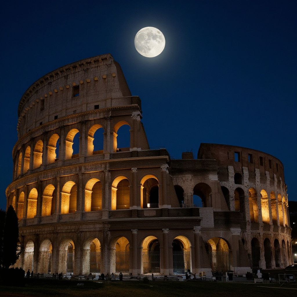 Photograph of illuminated Colosseum at night, with a bright full moon in the dark blue sky, highlighting its ancient arches and ruins.