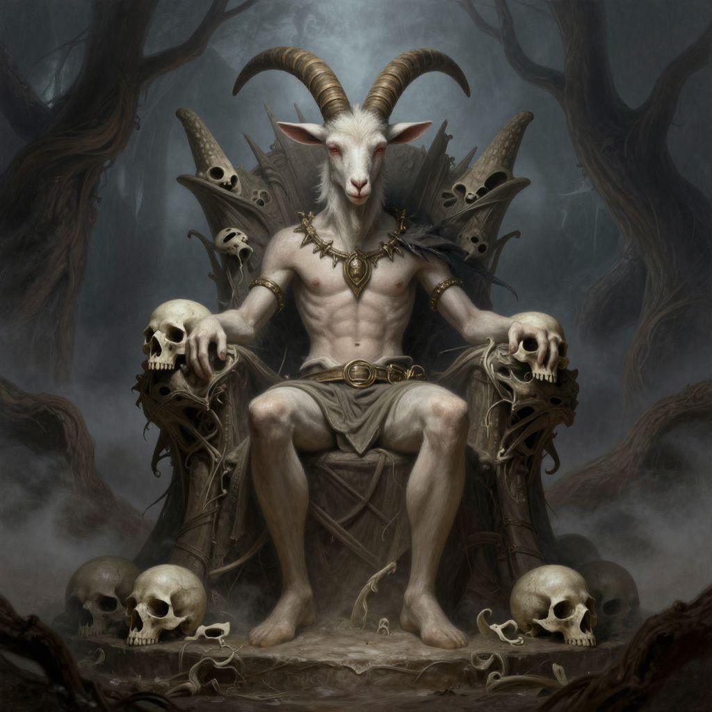 Baphemet character illustration, fusion of human and goat features, sitting on a throne made of skulls, ominous mist surrounding, dark fantasy setting with twisted trees, surreal and menacing atmosphere, highly detailed digital painting