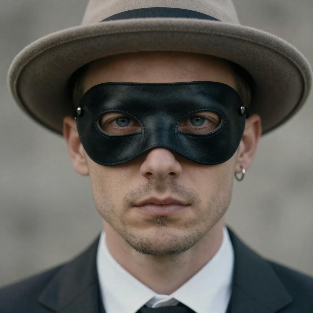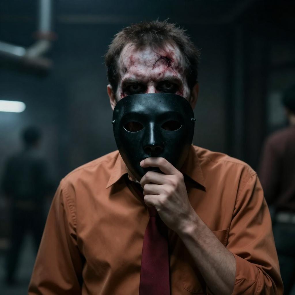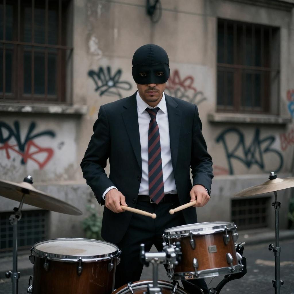 Masked man in dark suit, white shirt, and striped tie standing with drumsticks, next to a drum set, in a gritty alley with weathered buildings, graffiti, and metal bars on windows. Intense, focused expression. Urban, nighttime setting.