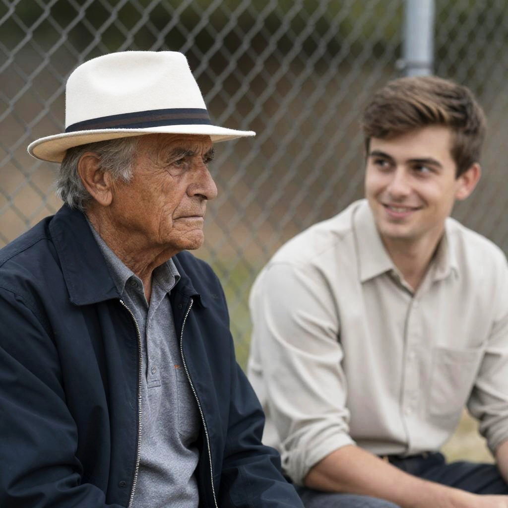 An elderly man wearing a beige hat, light gray shirt, and patterned scarf eats a sandwich while holding a sheet of paper. A younger man in a light gray suit and white shirt, wearing sunglasses and a wristwatch, leans over pointing at the paper. The scene is outdoors in a sunlit setting with blurred figures and a building with a blue roof in the background.