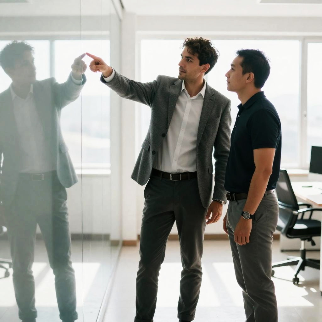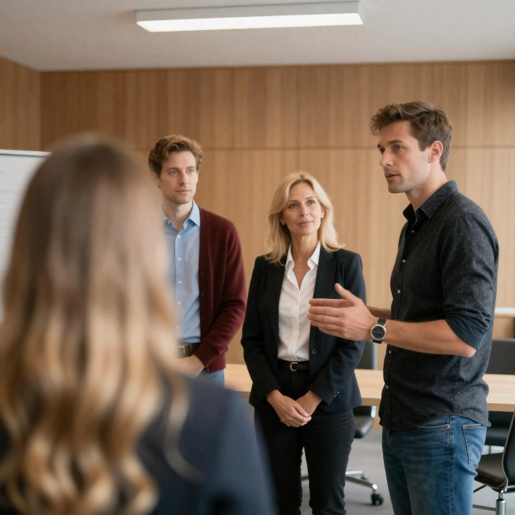Photograph of four people in a wooden-paneled room. Foreground: blurred blonde woman with wavy hair. Background: man with short brown hair, red cardigan, and blue shirt; woman with blonde hair, black blazer, and white shirt; man with short brown hair, black patterned shirt, and blue jeans, gesturing with his right hand. Bright lighting, ceiling lights.