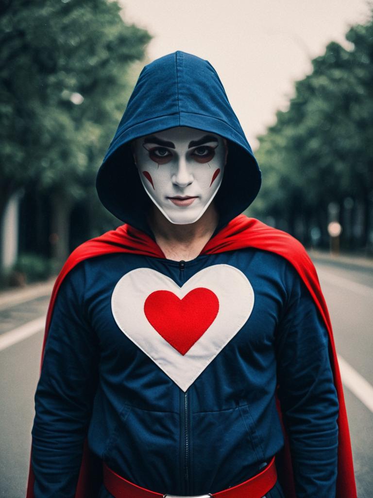 Portrait of a man wearing a blue hoodie with a large white heart and red heart symbol on the chest, a red cape, and red belt. His face is painted white with red and black makeup, giving a dramatic and cinematic cosplay appearance. The background shows a blurred street lined with trees.