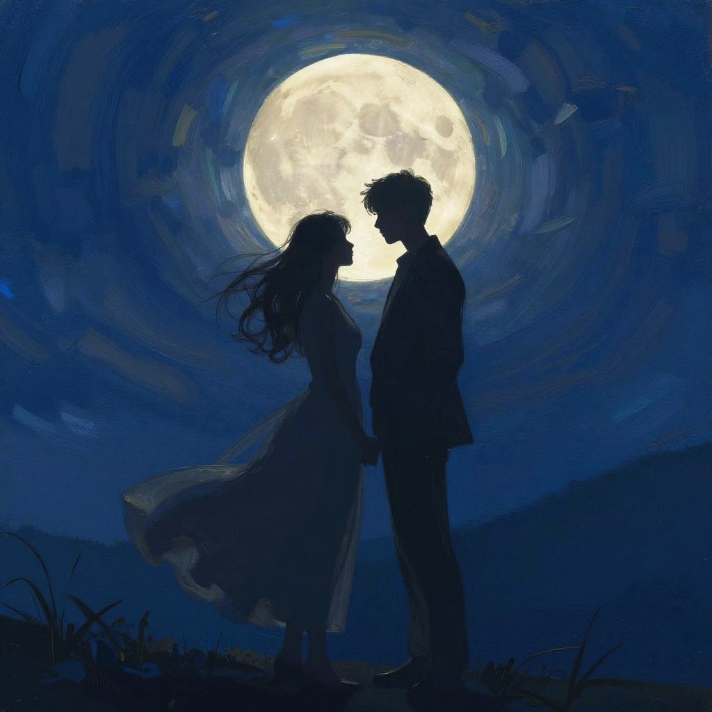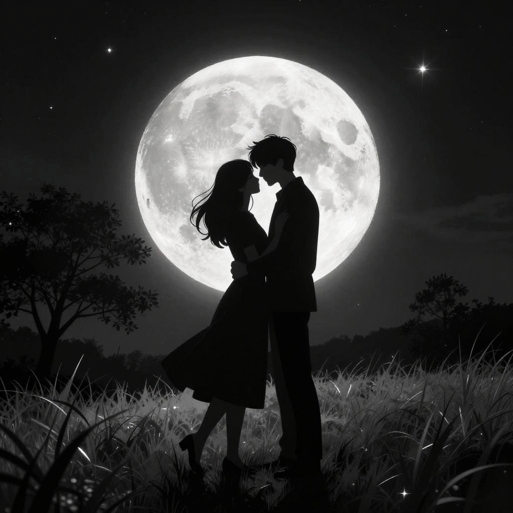 A dreamy, black-and-white digital illustration shows a silhouetted couple embracing under a large, luminous full moon. They stand on a grassy hill with a tree to the left. Stars dot the night sky, adding a magical feel. The couple's figures are dark and shadowy, with the woman's dress and the man's suit subtly detailed. The moon's glow contrasts sharply with the dark foreground, creating a romantic, ethereal atmosphere.