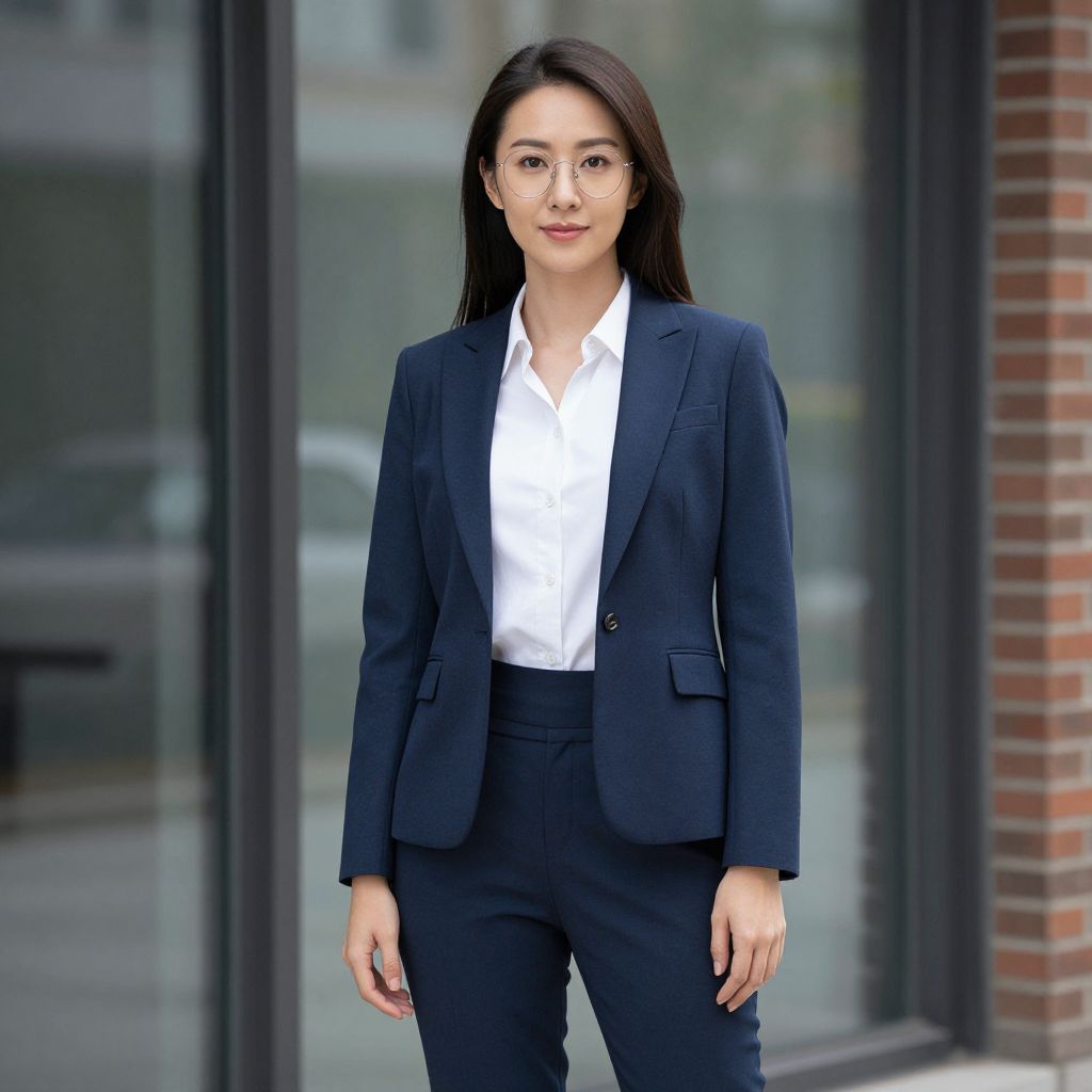 Photograph of an Asian woman standing outdoors in front of a glass building with a brick wall on the right. She has long, straight black hair and wears glasses, a dark blue blazer, white dress shirt, and high-waisted dark blue pants. Her expression is neutral, and she stands with her arms relaxed at her sides. The background is slightly blurred, highlighting the modern urban setting. The lighting is natural, and the overall color palette is professional and muted.