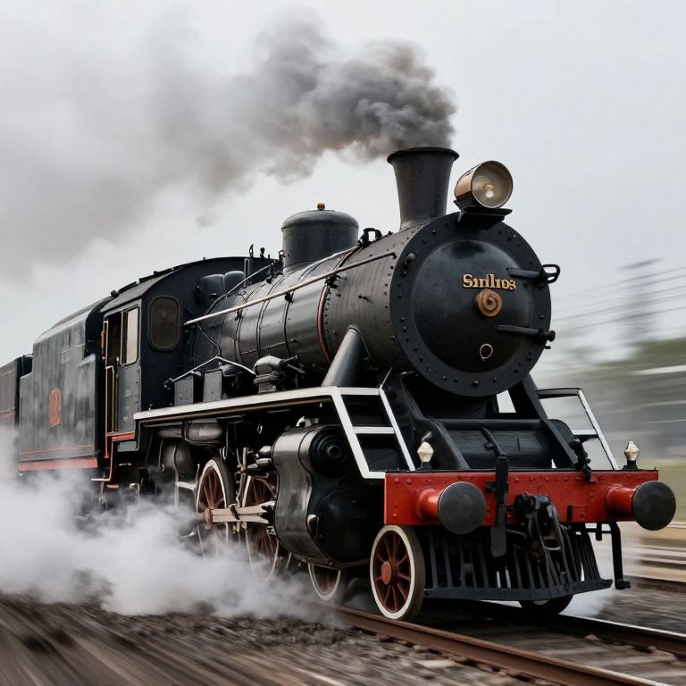 Img2img free interpretation where a simple line drawing of an old steam train evolves into a hyper-realistic, steam-powered futuristic locomotive, surrounded by mist and dynamic motion effects, created in a dramatic, cinematic style.