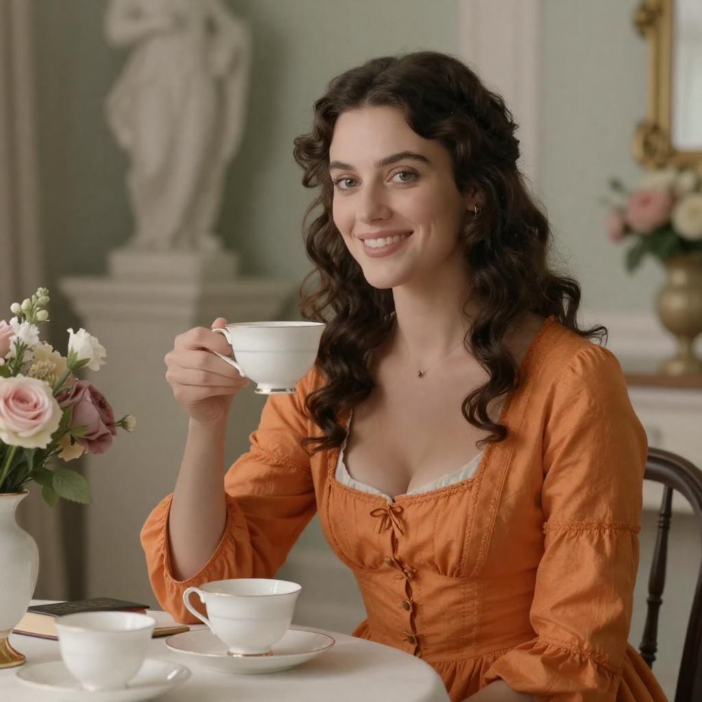 Photograph of a fair-skinned woman with dark brown, wavy hair in an 18th-century-style orange dress with a low neckline, revealing ample cleavage. She smiles while holding a teacup at a formal table with white teacups, a book, and a floral arrangement in the background. A white statue is visible on the wall behind her.