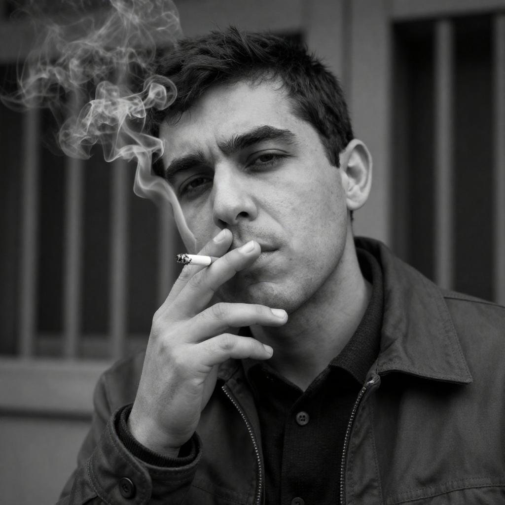 Photograph of a man with pale skin, black beret, glasses, and gray coat, smoking a cigarette, in a busy outdoor market. Background includes blurred people, one with blue and green jacket, and market stalls. Man's face focused, lips slightly pursed. Multiple people in background, some with hats. Overcast lighting.