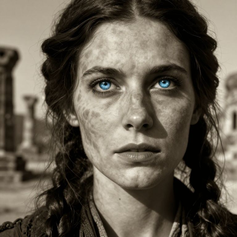 A portrait photograph captures the enigmatic gaze of an experienced time traveler, her dreamy blue eyes reflecting the flickering light of ancient ruins stretching to infinity. The unique perspective is set from a 'bug's-eye view', masterfully blending elements reminiscent of old sepia-tononed photographs with crisp 4K digital rendering, creating a captivating visual contrast. Shadows dance across her enduring face, etched with lines that tell stories of time and space, infusing the portrait with an air of mystery and introspection. This photorealistic depiction invites viewers into a world where past, present, and future intertwine, evoking a rich tapestry of emotions.