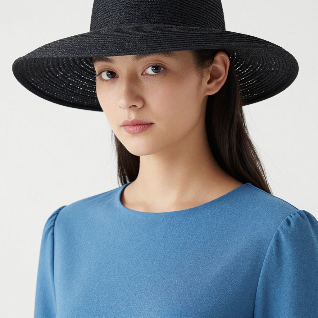 Photograph of a young Asian woman with fair skin and long, straight black hair, wearing a black, textured, wide-brimmed hat that casts a slight shadow over her face. She has small, delicate features, dark brown eyes, and light pink lips. She is dressed in a simple, light blue, long-sleeved top with slight puffed shoulders. The background is completely white, making her the focal point of the image. Her expression is neutral, and she is looking slightly to the left of the camera. The hat's texture is visibly woven, contrasting with the smooth fabric of her top.