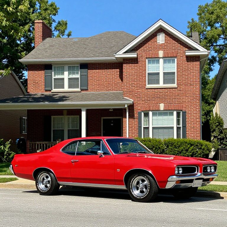 Vibrant red 1968 Pontiac GTO parked gracefully in front of a classic brick house, showcasing its iconic design and pristine condition against a backdrop of manicured greenery and a clear blue sky.