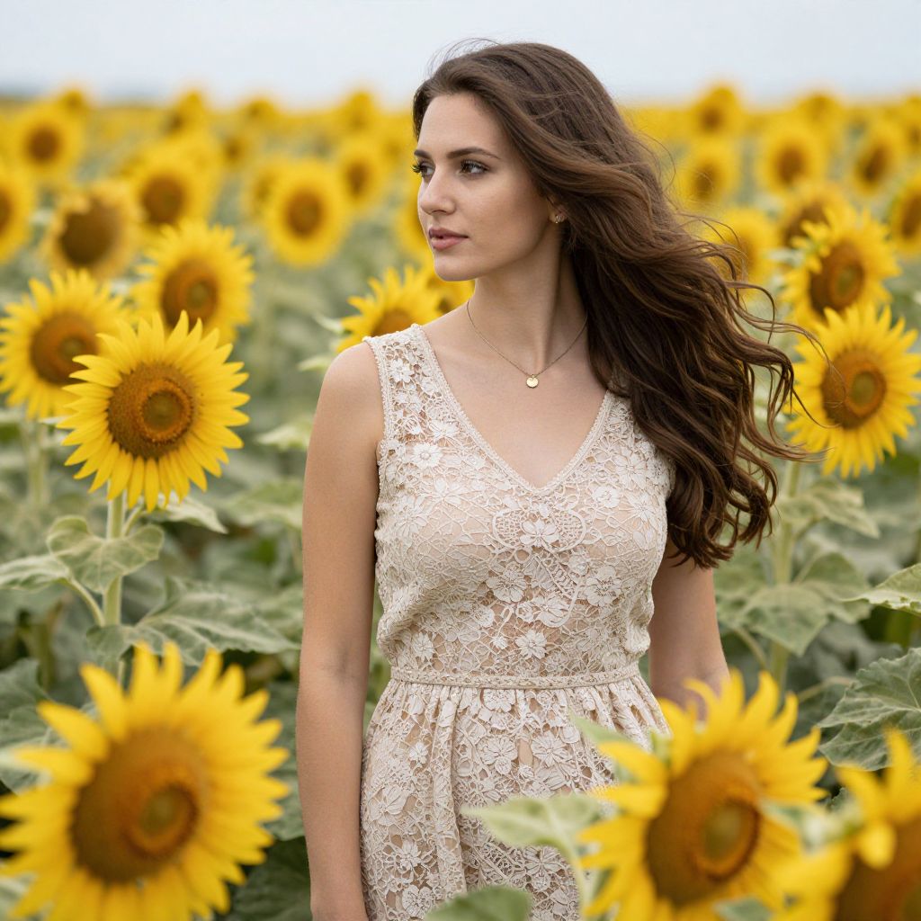 Woman standing amidst a vibrant field of sunflowers, her long brown hair flowing gracefully as she wears a delicate lace dress adorned with floral patterns, complemented by a simple necklace featuring a small pendant.