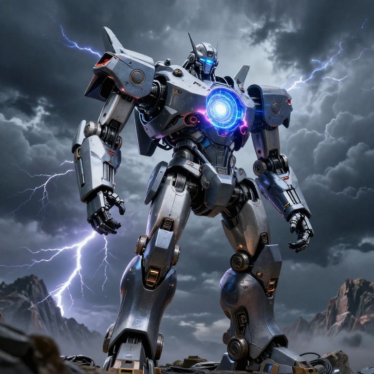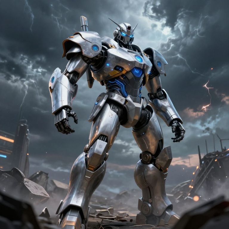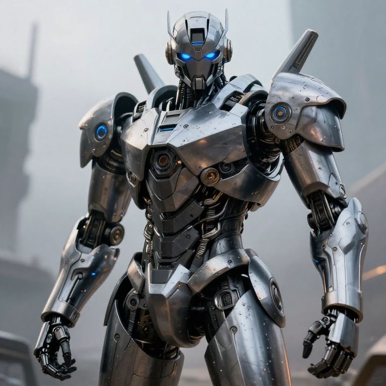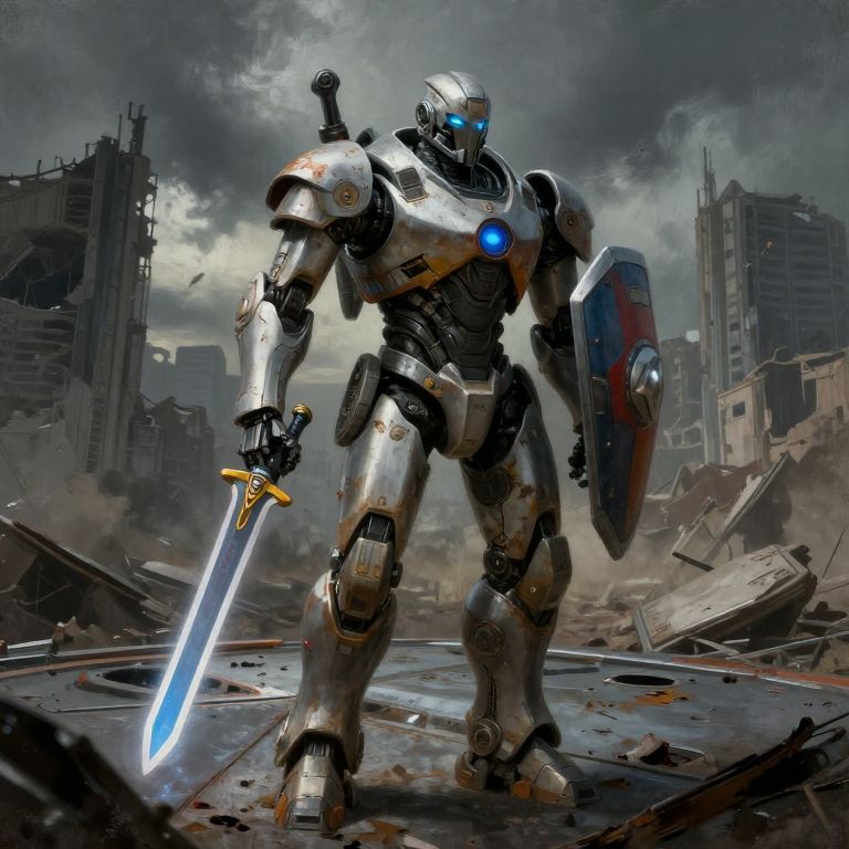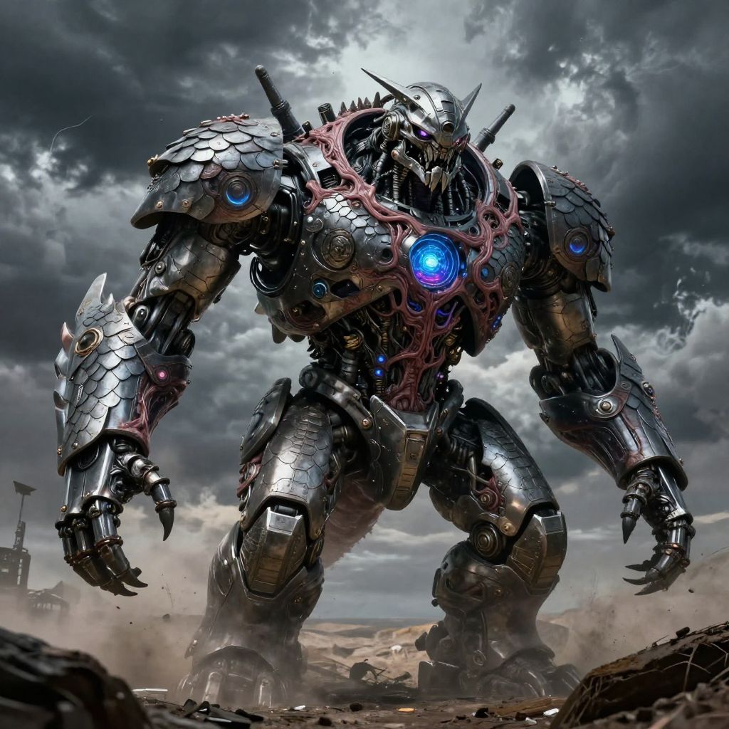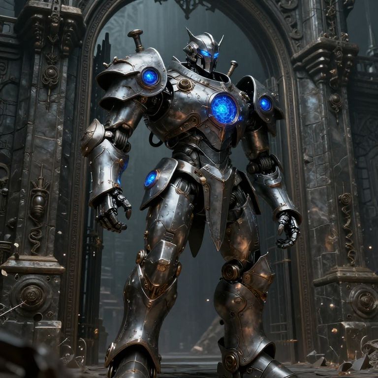 Robot Dark Souls sentinel guarding an ancient fortress gate, mix of steampunk and gothic elements, weathered metallic surfaces with glowing blue energy cores, dark fantasy style