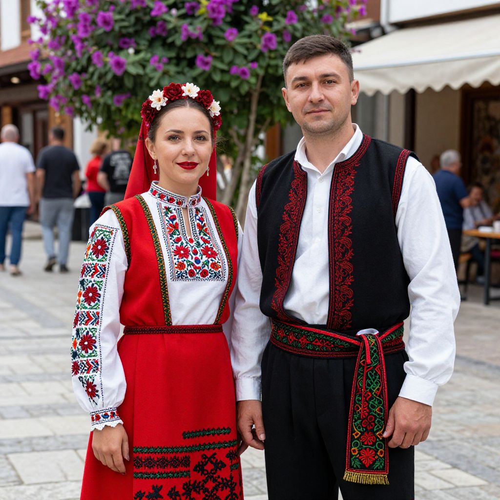 Two individuals dressed in vibrant Macedonian national costumes from Skopska Crna Gora stand side by side, with the woman wearing a red dress adorned with intricate embroidery and a floral headpiece, while the man dons a black vest with red accents and a matching sash, set against a backdrop of purple flowers and a bustling street scene.