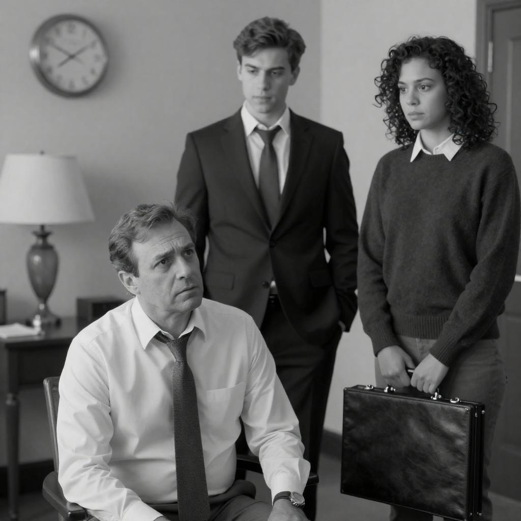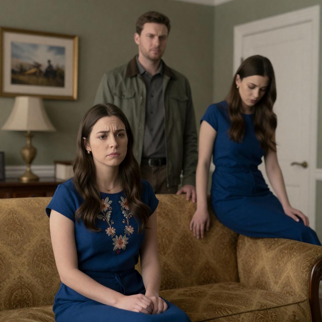 Photograph of three people standing in front of a red brick house with a white picket fence. Man on left wears purple jacket, yellow pants, red scarf; woman in center wears white dress, holds books; woman on right wears black dress. Green lawn, bushes, and steps lead to house entrance. Man looks left, women look at man.