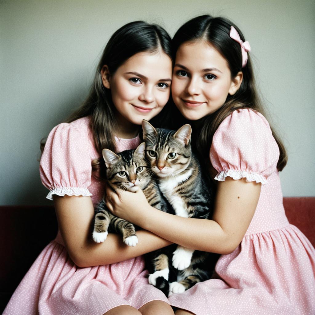 Two Sisters in Pink Dresses Holding Tabby Cats