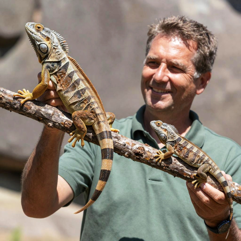 Photograph of a middle-aged man with light brown hair, smiling, holding a large, ured, green and brown lizard on the left, and a dark, rough tree branch with a small lizard on the right. Background is a sunny, rocky outdoor setting. Man wears a green, short-sleeved shirt. Lizard on left is lifted upwards, lizard on right is on the branch. Man's expression is friendly.