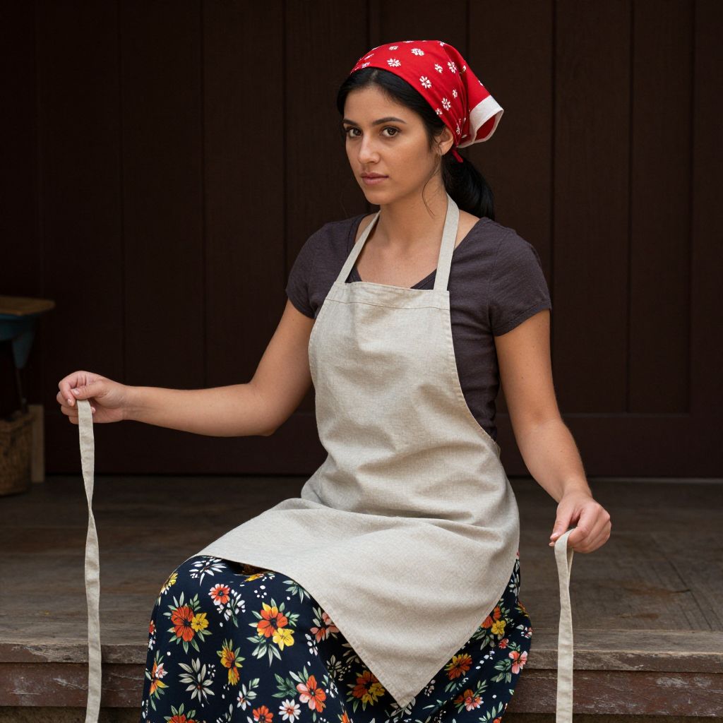 Woman seated, holding out apron, wearing red head kerchief, flowered skirt.