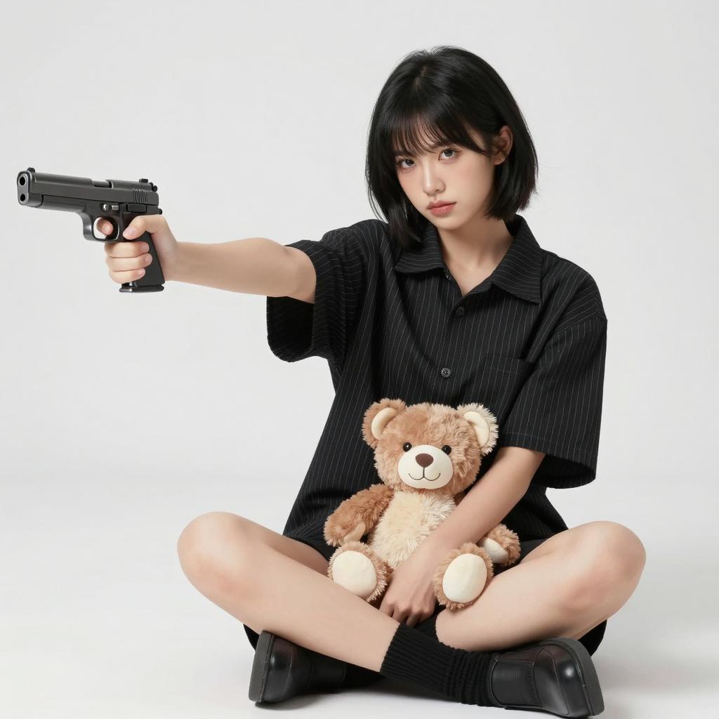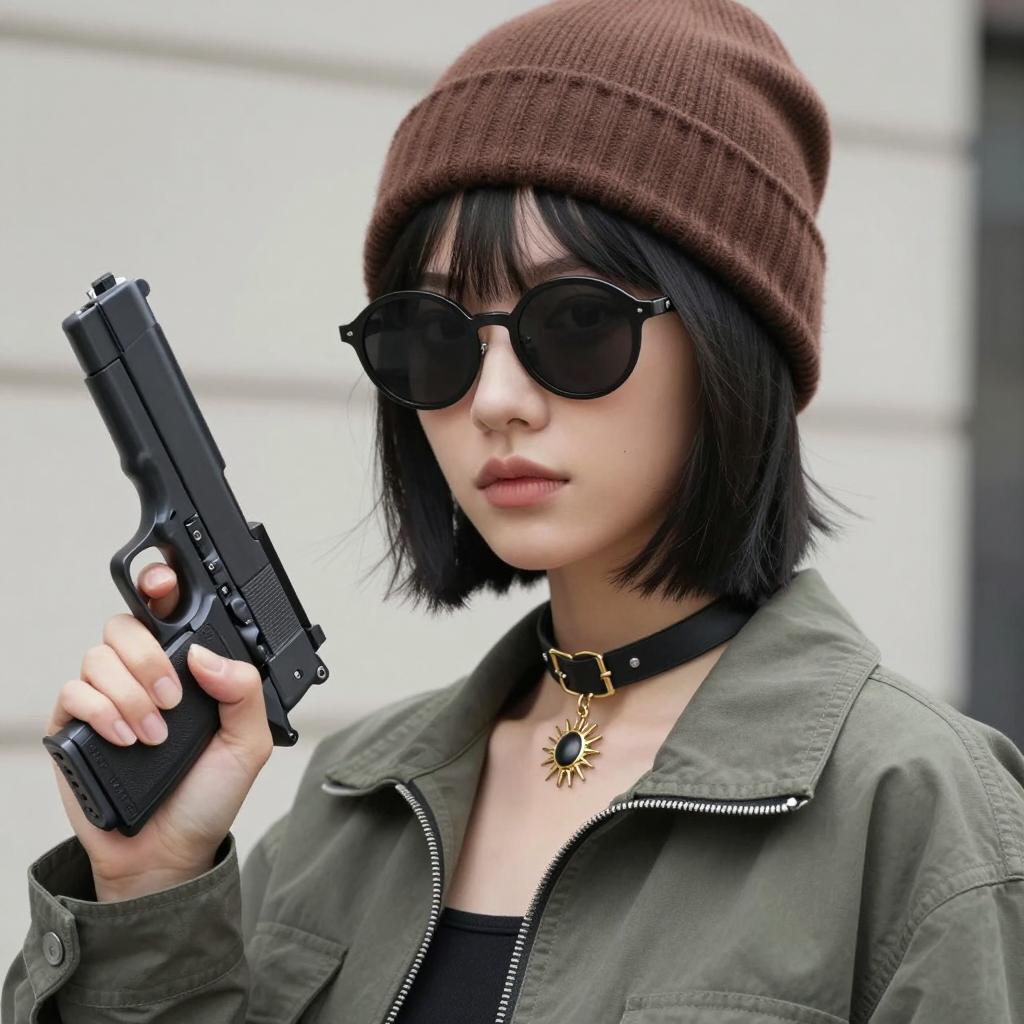 Close-up photograph of a young woman with fair skin, short brown bob haircut, and wide brown eyes. She holds a silver revolver with her right hand, positioned against the side of her head. Her lips are slightly parted, showing her teeth. The background is softly lit with a light, blurry effect.