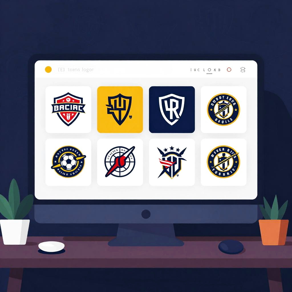 Team logo generator interface illustration displaying a creative workspace with various logo drafts on screen, vibrant colors and typographic experiments, modern minimalist style, digital art emphasizing creativity and versatility in sports team branding