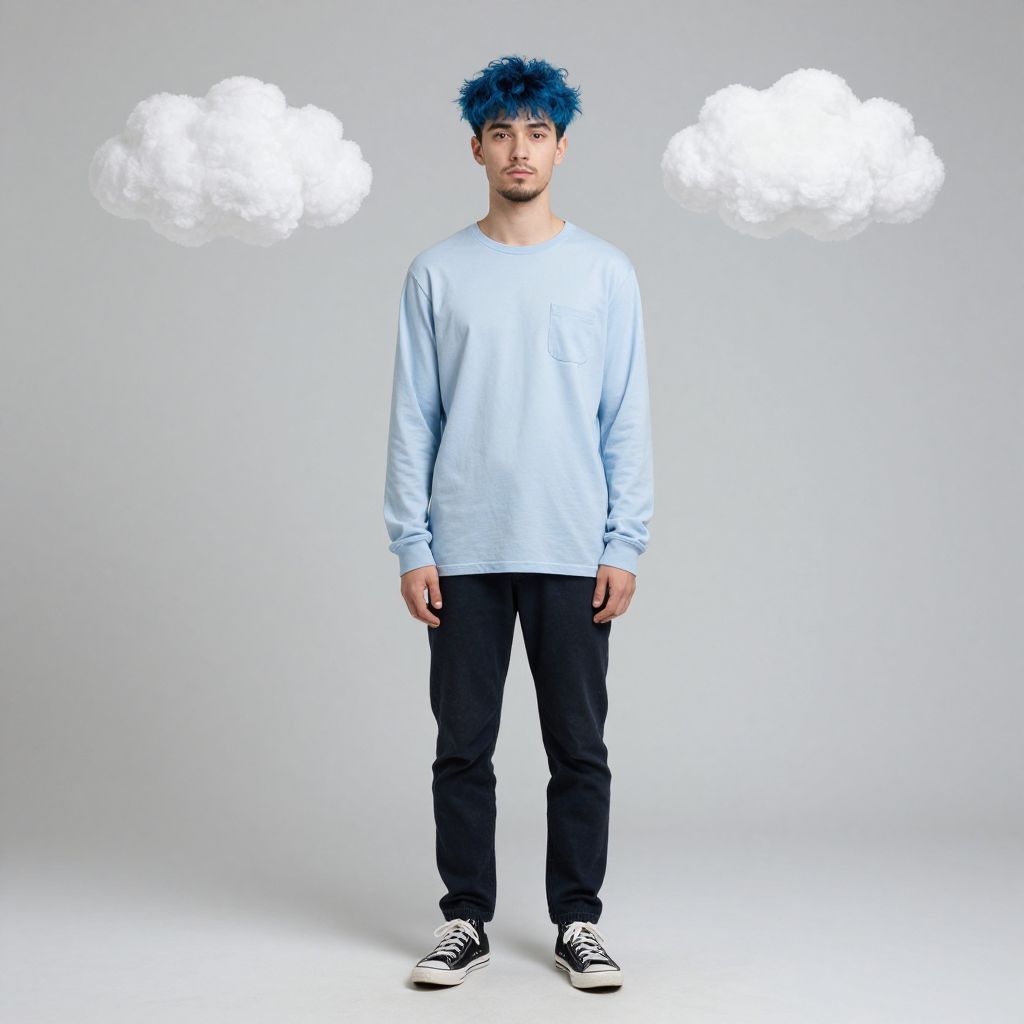 Photograph of a young Asian man with blue, spiky hair standing against a light gray background. He wears a light blue, long-sleeve shirt, black pants, and black-and-white sneakers. His expression is neutral, and he has a slight beard. Two white, fluffy cloud shapes float in the background, symmetrically placed on either side of his head. The lighting is even, highlighting his outfit and hair color. The overall style is minimalist and modern.