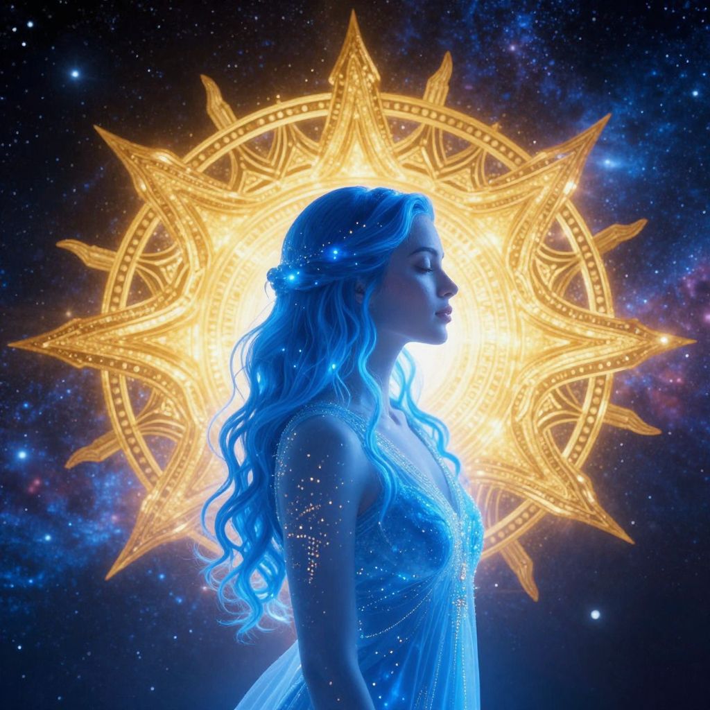 Digital art of a blue-haired woman in a glowing, starry dress, silhouetted against a radiant, golden sun mandala in space.
