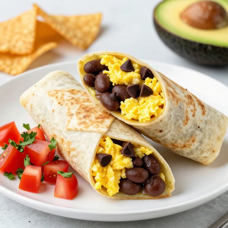 Two perfectly rolled breakfast burritos, filled with vibrant yellow scrambled eggs and rich brown beans topped with chocolate chips, rest on a white plate alongside diced tomatoes and cilantro, with tortilla chips and half an avocado visible in the background.
