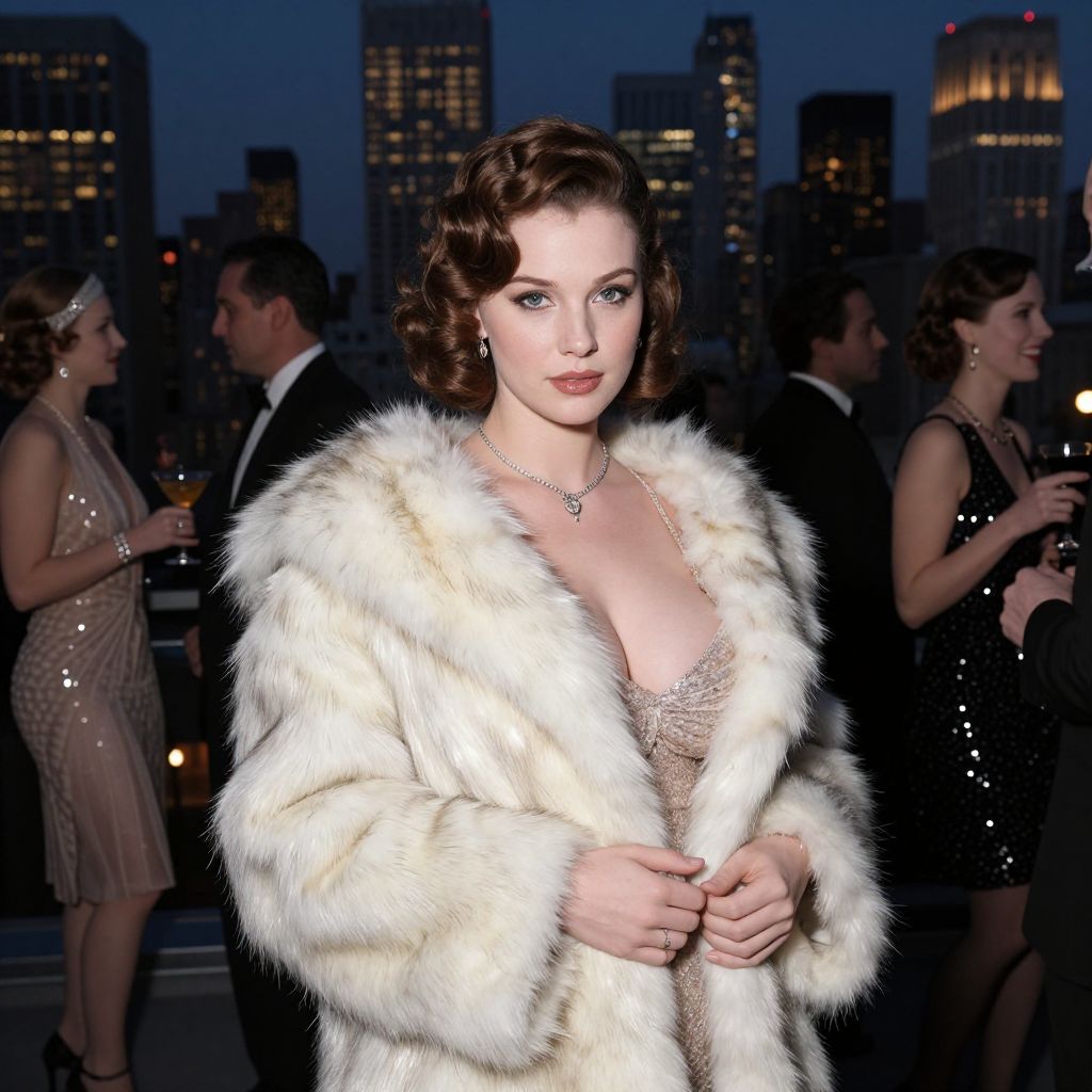 A regal woman in a 1930s socialite outfit, with fair skin, delicate porcelain features, and a knowing gaze, wearing an opulent fur coat of white and silver mink, standing at a lavish rooftop party in New York City at night, surrounded by flapper dresses and elegant cocktails, the city skyline glowing in the twilight.. The woman has big tits and cute face