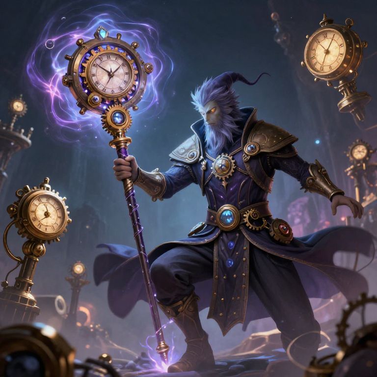 A digital fantasy artwork depicts a blue-furred, horned wizard with glowing eyes, holding a magical staff topped with a floating, glowing clock surrounded by purple energy. He wears an ornate, dark blue coat adorned with golden and blue gemstones. Surrounding him are floating, illuminated clocks with glowing faces. The background is a mystical, blue-hued, foggy environment with intricate, glowing mechanisms. The wizard's stance is powerful, with one leg forward and the staff raised, exuding an aura of magic and control. The overall style is vibrant and dynamic, with a focus on fantasy and steampunk elements.