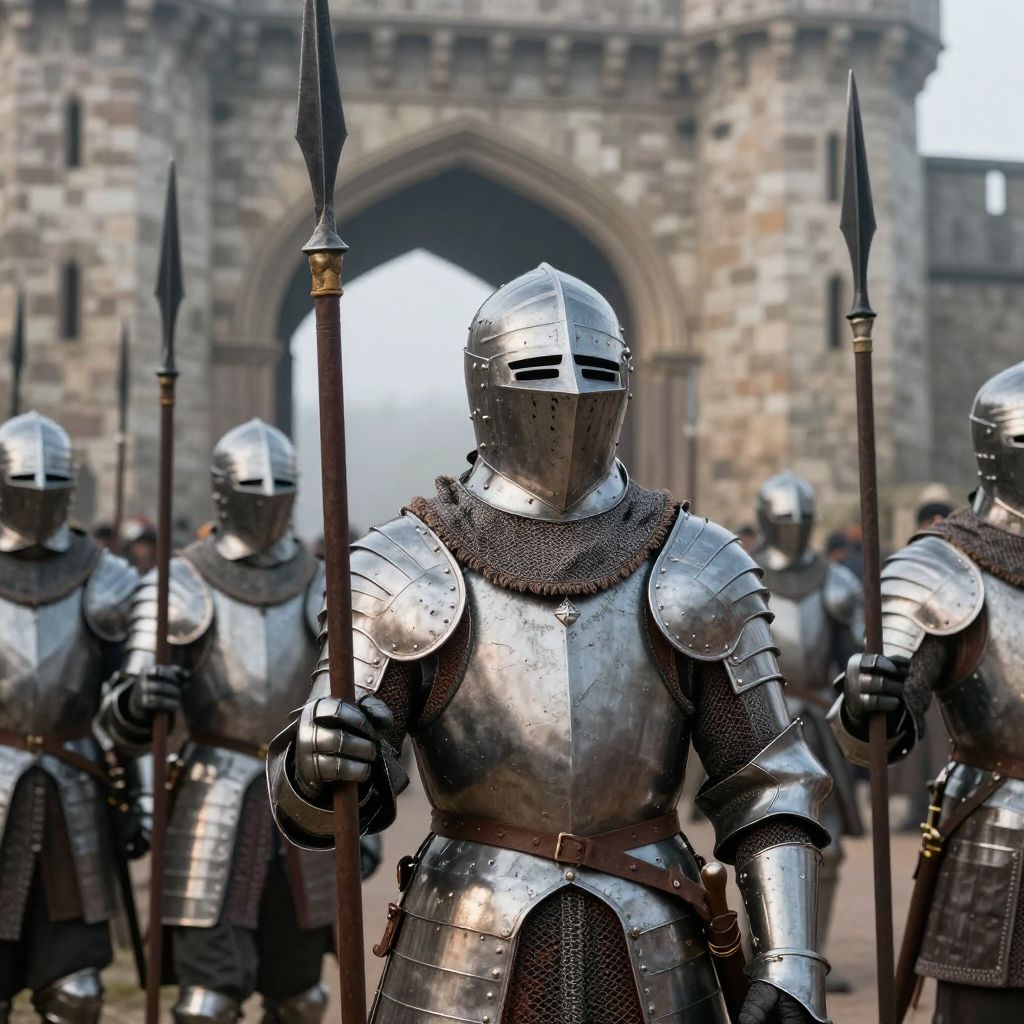 Close-up of medieval castle guards in iron plate armor, holding spears and standing at the grand castle gate, detailed textures, realistic shadows, misty morning setting.