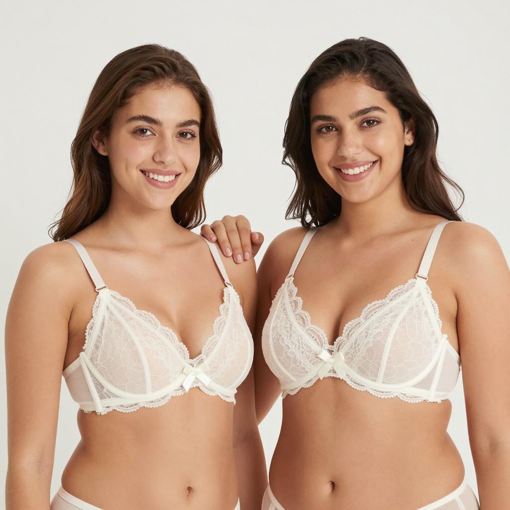 Two women standing side by side, smiling. Both have long dark brown hair, wearing sheer white lace bras with small bows. The woman on the left has smaller breasts, lighter skin, and a slim build. The woman on the right has larger breasts, fair skin, and a curvier build. The woman on the right's hand is on the left woman's shoulder. Bright white background.
