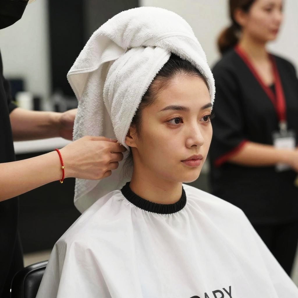 Photograph of an Asian woman with light brown skin and dark hair, seated in a beauty salon. She has a white towel wrapped around her head, covering her hair, and wears a white salon cape with a black collar. A person's hand, with a red bracelet, is adjusting the towel on her head. In the blurred background, another person with light skin and dark hair, wearing a black salon uniform with red accents, stands. The salon has white and black walls with indistinct objects. The woman's expression is neutral, and the lighting is bright.