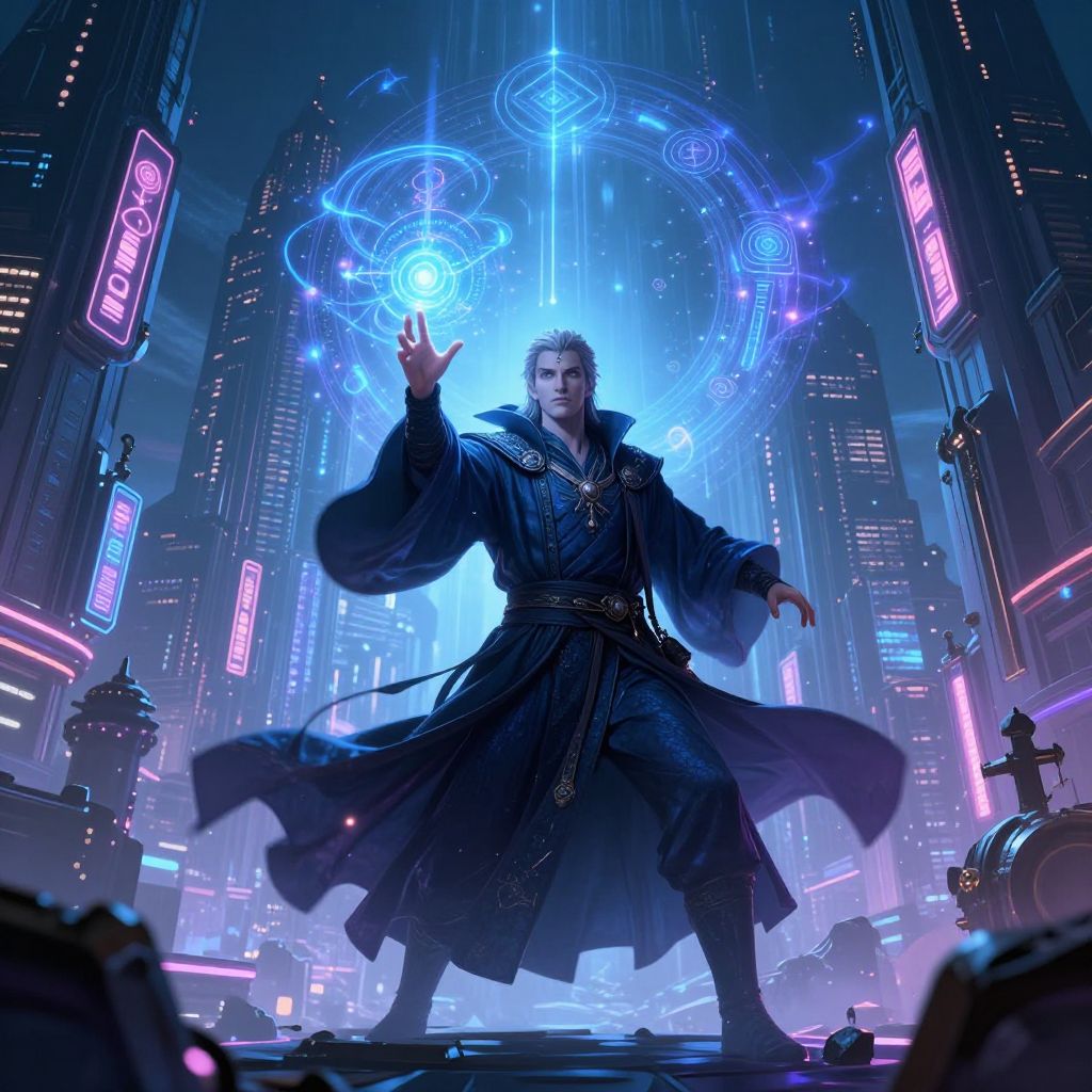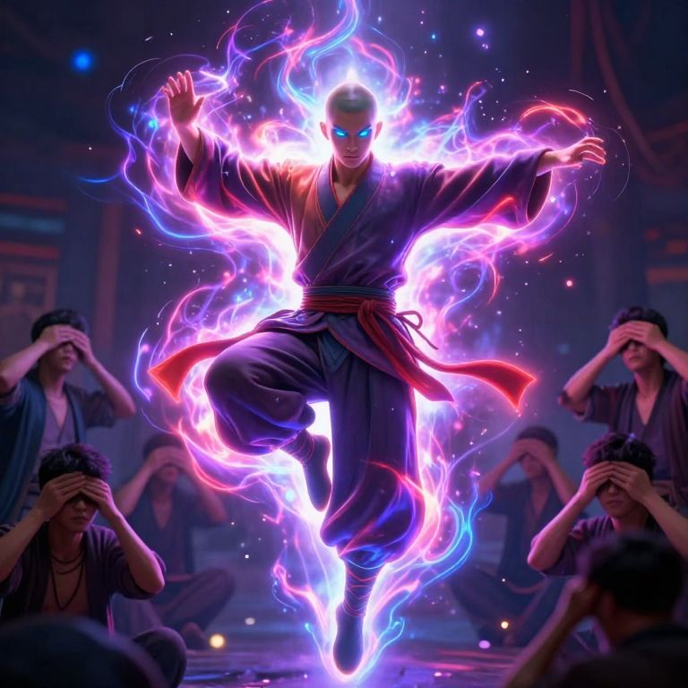 Digital art of a glowing, blue-eyed martial artist with fiery, multicolored energy surrounding him, surrounded by awestruck onlookers in dim