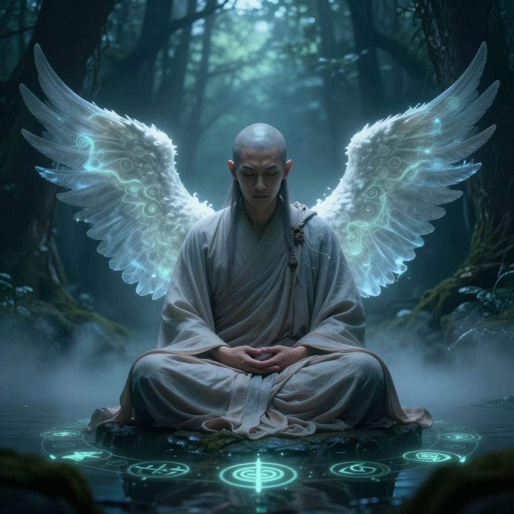 Off-center composition, dynamic portrait of the most powerful mystic martial arts warrior monk in a fighting stance with his arms out wide and one foot kicking, he is floating 5 feet above the ground, he has an extremely bright glowing multi-colored magical aura animeglow full of chi power, his eyes are shining bright blue, he is surrounded by thugs that are blinded by his aura looking away and covering their eyes, fantasy world, Stunning visuals, Texture, beautiful face features, photorealistic, photorealism, beautiful image, cinematic, beautiful lighting, sharp focus, very stylish, illustration, pscho4rt, surreal, abstract, glitch, animeglow, purpleglow, redglow, greenglow, blueglow